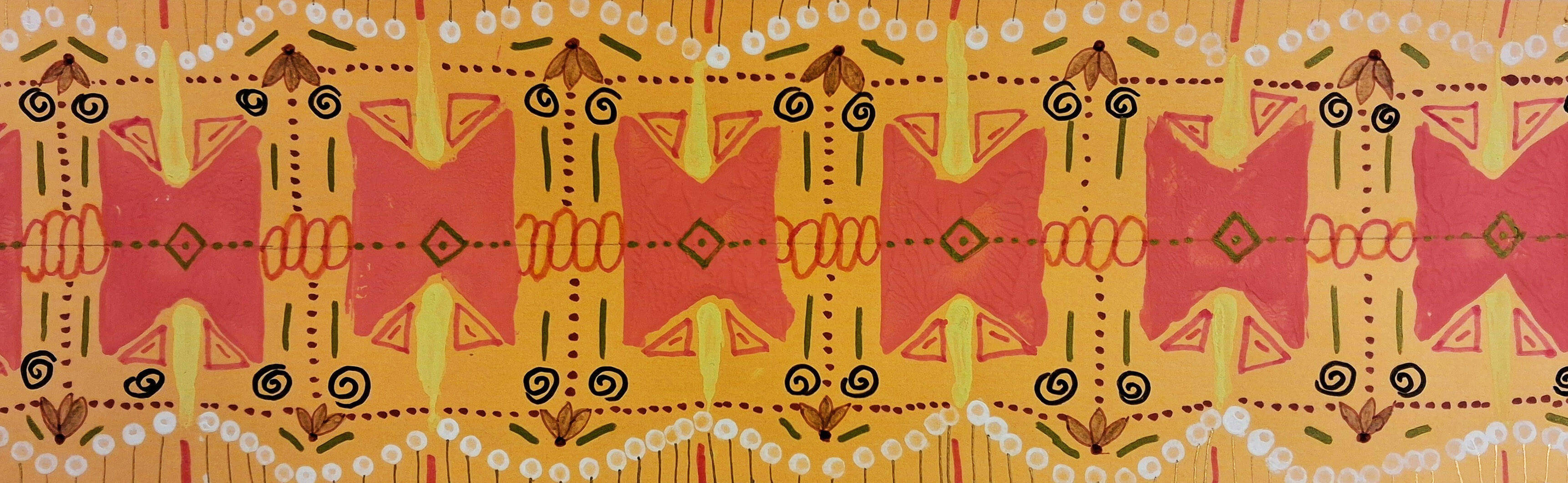 „Das Thema hat mir viel Spaß gemacht, weil ich mit wiederkehrenden Formen und Farben experimentieren konnte. Außerdem fühlte ich eine innere Ruhe dabei, die Bordüre zu gestalten. Mir war wichtig, ein harmonisches Muster zu gestalten, das durch Symmetrie und warme Farben zusammenhängend wirkt. Die Bordüre soll dekorativ und filigran sein.“